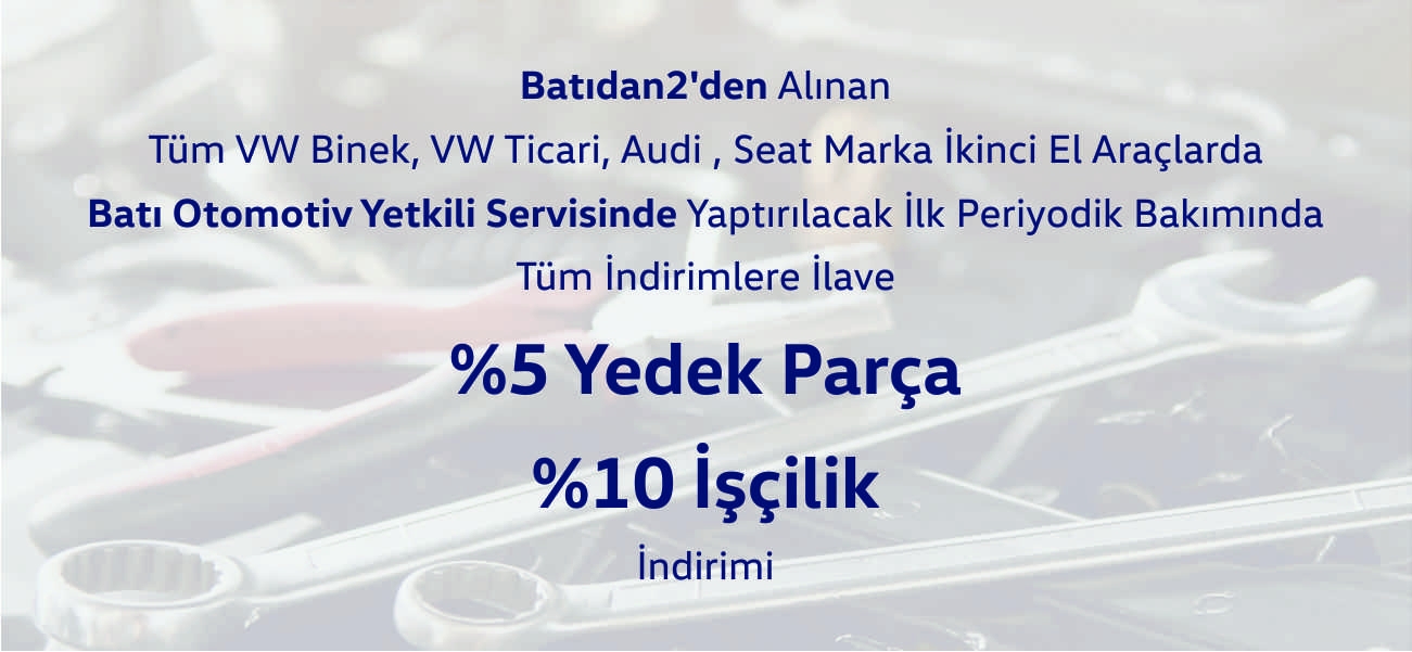 Batıdan2'den alınan tüm VW Binek, VW Ticari, Audi, Seat marka ikinci el araçlarda Batı Otomotiv Yetkili Servisinde yaptırılacak olan ilk periyodik bakımında tüm indirimlere ilave %5 Yedek Parça, %10 İşçilik indirimi.